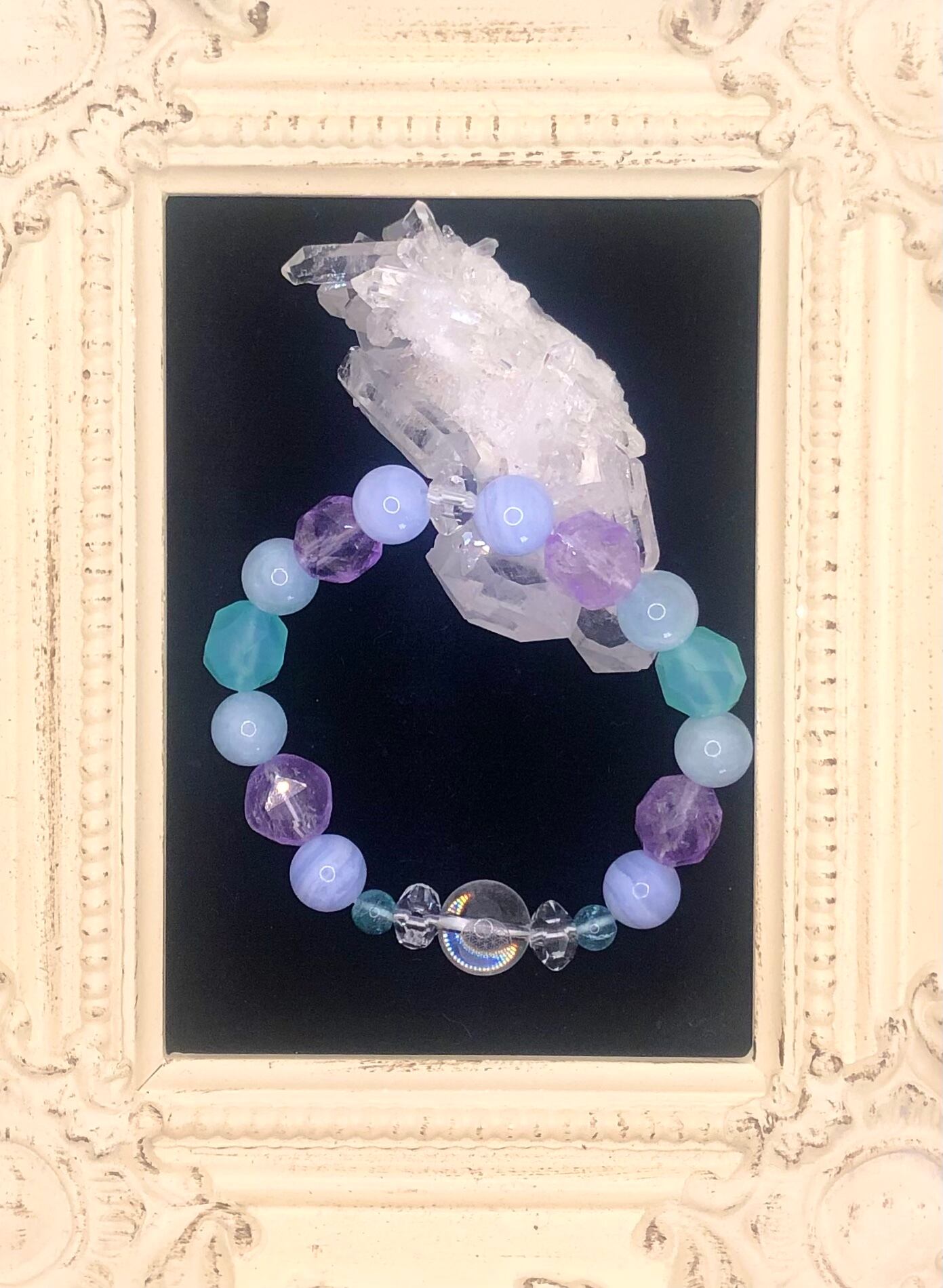 水晶、アパタイト、アクアマリン、ラベンダーアメジスト、ブルーカルセドニー、ブルーレースアゲート