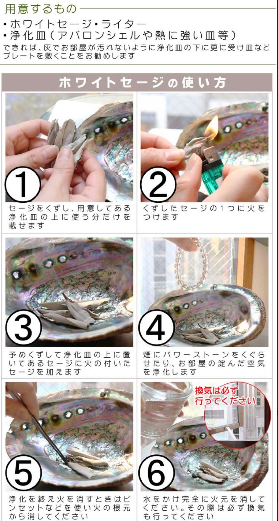 ホワイトセージの葉の先に火をつけます。 ホワイトセージに火をつけたら、貝殻(又は代用の受け皿)の上に載せます。 火をつけても一度に燃える事はなく、お香の様にゆっくりと火が燃えてゆくのが特徴です。 火の元には、気を付けて管理しましょう。